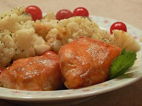 Итого на 100 грамм 162 ккал Б/Ж/У 17.9 / 6.6 / 8.2 Это стоит попробовать, не проходите мимо. Лучше всего для этого подходит семга, лосось. С другими, я правда, не пробовала) Ингредиенты: Филе семги Маринад: Соевый соус – 2 ст.л. Кунжутное масло -1 ст.л. Имбирь(натёртый) -1,5 ст.л. Сухой – 0,5-1 ч.л. Мёд -3 ст.л. Сок лайма или лимона -2 ст.л. Щепотку молотого перца Приготовление: Подготовить рыбу, лучше всего порезать на кусочки грамм по 200. Смешать все компоненты маринада и мариновать рыбу не менее 2 часов, лучше поставить в холодильник. Маринад с рыбы через 2 часа удалить, мы им будем поливать рыбу во время жарки. Уложить рыбу в форму и печь в разогретой заранее духовке 15 минут при температуре 200С, поливая отцеженным маринадом. Рыбка получится блестящая и красивая! Идеально сочетается с рукколой и овощами на пару. Можно посыпать кунжутом. Приятного аппетита!
