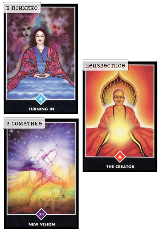 Это продолжение вчерашней работы. Кверентка: А на здоровье надо расклад? Вы говорили - три карты. Я: Попробуйте как можно точнее сформулировать свой вопрос про здоровье. Тогда, думаю, поймем, как раскладывать. Кверентка: Больна я или нет? Мне все говорят пить антидепрессанты, а я не пью. Но мне немного страшно - вдруг я не права? Правда, при любом раскладе пить их не буду. Но моё состояние меня беспокоит. Хочу понять - моё состояние - от болезни или от страхов. Я: То есть, искать ли причины в психике или в соматике? Кверентка: Не знаю. Нарушена биохимия мозга или нет. Я: Простите, в такой формулировке не возьмусь. Она слишком медицинская, а я-то не врач. Кверентка: Ок. А как возьмётесь? Я: Вот так, как написал выше. Кверентка: Давайте так. Я: Делаю... Я: Хотите что-то сказать о картах до меня? Кверентка: Жду вашего объяснения. Я: Если искать причины в психике - Обращение Вовнутрь. Да, это может получиться. Смотрите внутрь себя, находите причины страхов и ус