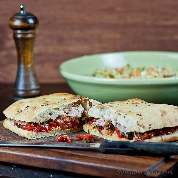 Полчаса будет достаточно, чтобы приготовить сэндвич из фокачча. В него будут добавлены и маринованные овощи. Нам понадобятся: Большая лепешка фокачча – 1 шт Вяленые помидоры – 1 шт Соленые перцы – 3 шт Каперсы – 1 десертная ложка Оливки – 1 десертная ложка Корнишоны – 8 шт Свежие помидоры – 4 шт Свежая мыты- 3 веточки Перец чили – 1 шт (без семян) Сок половины лимона Пармезан 30 грамм Берем готовые лепешки фокачча можно купить в супермаркете готовую лепешку. Заворачиваем в бумагу для выпечки и кладем в духовку, разогретую до 160 градусов на 5 минут. Нам нужны соленые перцы, оливки, вяленые помидоры, каперсы, корнишоны, свежие помидоры. Нам нужна комбинация поярче: три перца немного оливок горсточку зеленые и черные косточки вынимаем каперсы здесь нужны как приправа одну чайную ложку с горкой 6 связанных помидоров они дадут интенсивный яркий вкус. Корнишонов нужно будет всего 3 огурчика. Такое сочетание вкусов создает единое целое. Горький соленый привкус всё вместе еще возьмем н