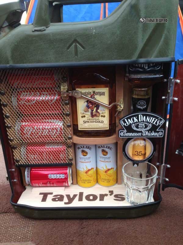 Самые разнообразные поделки делают умельцы из подручных материалов. Но чтобы канистры после их прямого назначения снова приносили реальную пользу в хозяйстве, верилось с трудом, пока не увидел классные поделки из канистр. Особо меня впечатлил мини-бар. для двух человек это самый раз. Веселый человек придумал. Молодец. Поставил в гараже такую канистру, никто не догадается, что у тебя есть заначка. Конечно, чтобы сделать такой мини-бар из канистры своими руками, хлопот не оберешься. Но зато какой кайф видеть глаза друзей, когда раскрываешь канистру! Какой аксессуар! Ни один водитель не откажется от такого тайника взять с собой в поездку. Не смотря на простоту материала, идея создания мини-бара кажется гениальной. Можно просто восхищаться находчивости и изобретательности авторов этих оригинальных идей. Такие мини-бары в виде канистр можно сделать по индивидуальному заказу, но своя, доморощенная, гораздо ближе и дороже. Видео мастер-класс