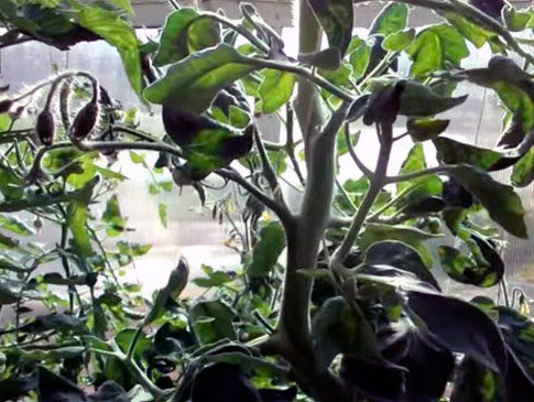 Порой случается, что при культивации томатов в условиях теплиц внезапно прекращается развитие совершенно здоровых кустов. Это сопровождается уплотнением и скручиванием листов, в такой ситуации не происходит цветение, а в случае появления цветков не появляются завязи на них. Так выглядит жирование помидоров. Эта неприятность возможна в случае культивации растений в теплицах при избыточном удобрении их разными составами, включая органические, например, навоз.