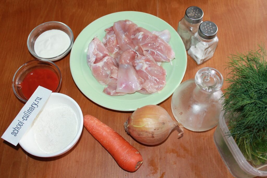 Готовим куриный гуляш со сметаной. Блюдо сытное и очень ароматное. Сочетание мяса с большим количеством лука и моркови делает кушанье богатым и самодостаточным. Можно его и с хлебом съесть. Чтобы получить густую подливу, в гуляш добавляют сметану, муку и томатную пасту. Последняя придает насыщенный цвет. А сметана делает мясо очень нежным с ярким сливочным вкусом. Ингредиенты: Приготовление Куриную грудку моем, нарезаем на ломтики как для отбивных. Каждый ломтик режем полосками. В казне или утятнице разогреваем масло, выкладываем мясо и обжариваем его ан среднем огне 10 минут, помешивая. Лук и морковь чистим, моем и измельчаем. Лук режем кубиками, морковку трем на терке. Перекладываем в емкость, где жарится мясо. Перемешиваем и тушим 15 минут, помешивая. Затем высыпаем муку, хорошо перемешиваем, чтобы не было комочков. При желании перед закладкой муку можно просеять, чтобы избавить от соринок и комков. Выливаем томатную пасту. Можно положить свежие помидоры, порезанные кусочками и оч