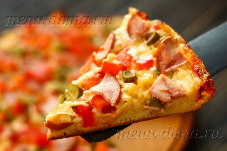 -13- Еще горячую выпечку разрежьте на порционные кусочки. Подавайте. Как видите, пицца на сковороде отлично пропеклась за считанные минуты. И не получилась внутри сырой, а снизу - подгоревшей.