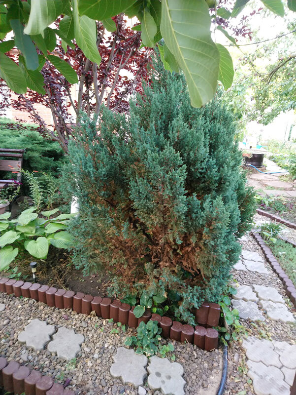 За всеми садовыми, да и домашними заботами, не до всего доходят руки. Вчера бросила взгляд на можжевельник у входа в беседку и ахнула. Со стороны дорожки с солнечной стороны растение выглядит вполне нормально, а вот со стороны беседки с западной стороны мне открылась такая картина.