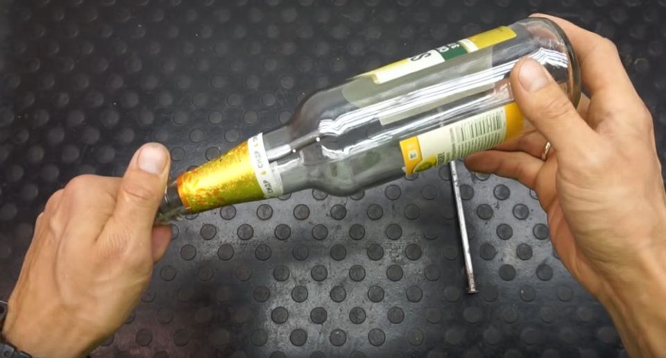 Привет всем друзья, интересная идея спора или как удивить друзей забив гвоздь в бутылку без молотка, погнали;) Вставляем один гвоздь в бутылку вот таким образом и прижимаем к стенке бутылки Вторым гвоздем начинаем бить по нему сверху К сожалению с первого раза не удачно получилось и откололось горлышко Но останавливаться мы не собираемся Со второго раза получилось отличное отверстие без сколов и трещин Вот таким способом возможно забить гвоздь в бутылку без молотка и трещин Ставь палец вверх дружище, сейчас в трудное время как никогда нужна поддержка