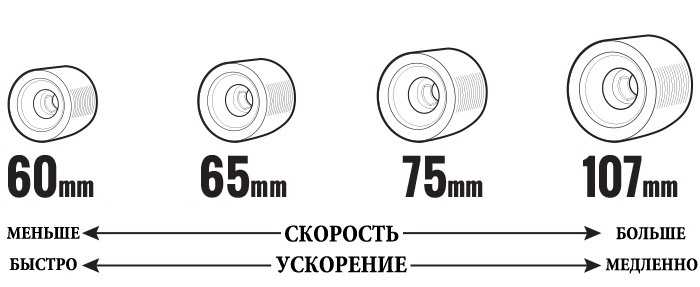 3. Форма Итак, поехали. Диаметр колеса Лонгбордические колеса бывают от 62 до 100+ миллиметров в диаметре. Маленькие (62-70 мм) колеса медленнее больших, и поэтому хорошо подходят для обучения катанию или катанию техничного слалома. Достаточно чувствительны к неровностям дороги, качеству асфальта и лишним предметам на пути — небольшой камушек может легко привес