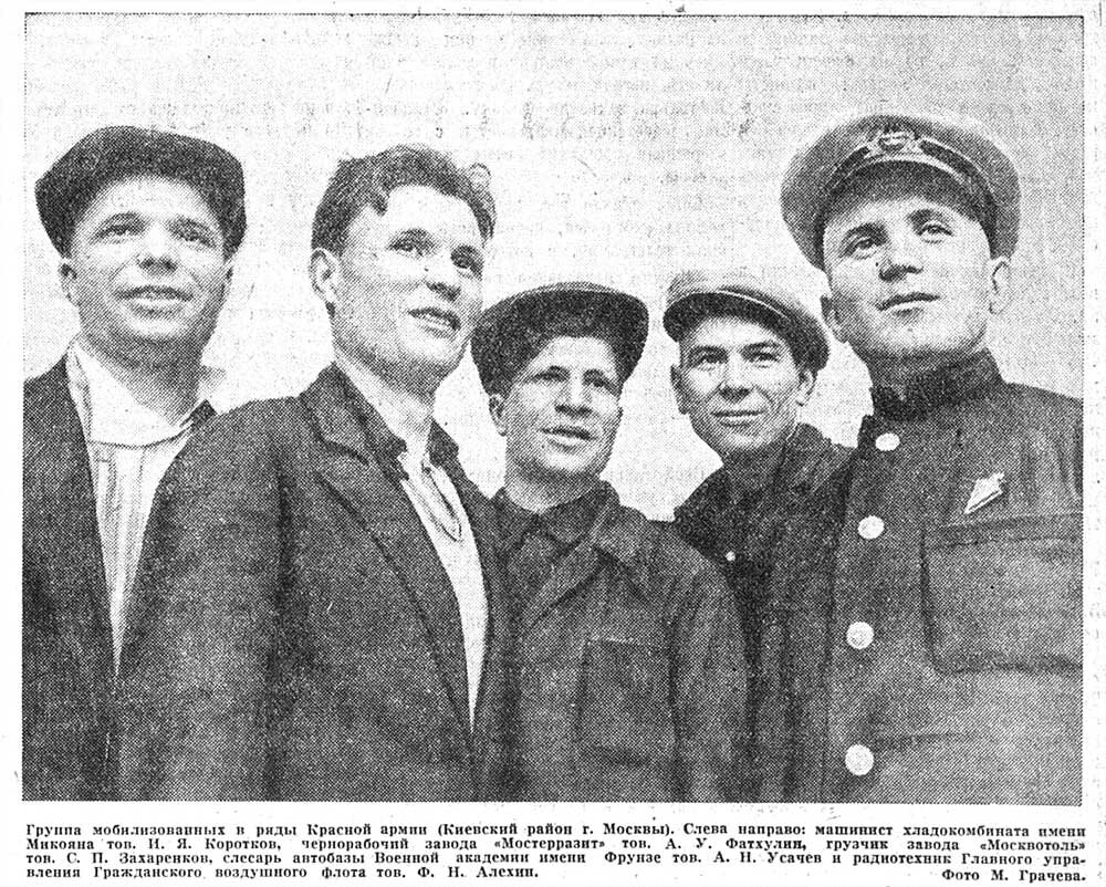 Группа мобилизованных в ряды Красной армии (Киевский район г. Москвы). Слева направо: машинист хладокомбината имени Микояна тов. И. Я. Коротков, чернорабочий завода «Мостерразит» тов. А. У. Фатхулин, грузчик завода «Москвотоль» тов. С. П. Захаренков, слесарь автобазы Военной академии имени Фрунзе тов. А. Н. Усачев и радиотехник Главного управления Гражданского воздушного флота тов. Ф. Н. Алехин. Фото М. Грачева. «Известия» № 148 (7524) от 25.06.1941 г. ПРЕССА ВОЙНЫ 1941-1945