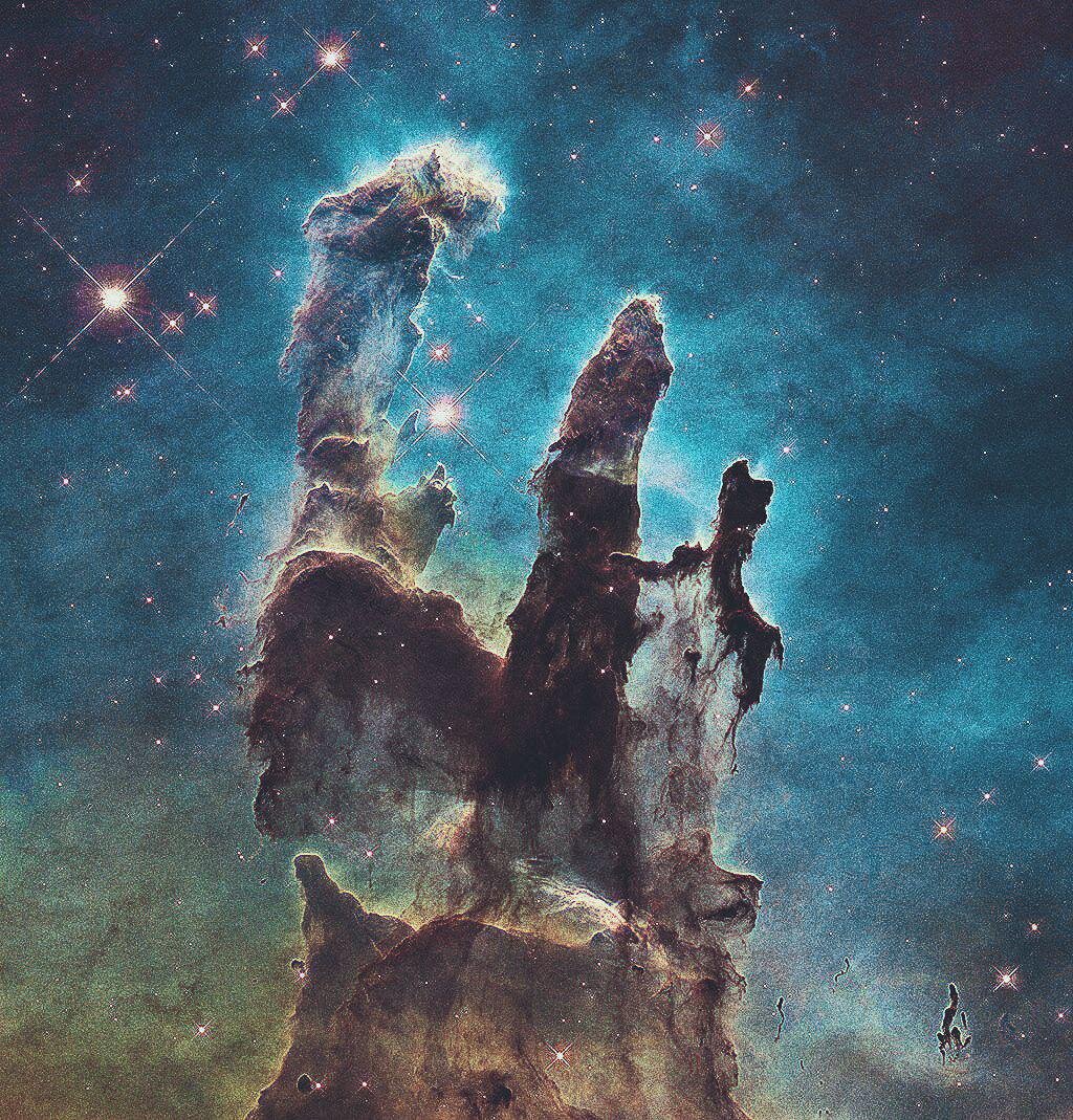 Атом кислорода без двух электронов придаёт Столпам Творения синее свечение, атом водорода без одного электрона заставляет газ сиять зелёным, а атом серы без одного электрона придаёт сиянию красный цвет. А призрачное голубое свечение вокруг Столпов – это свет материи, которая испаряется под воздействием температуры и солнечного ветра.