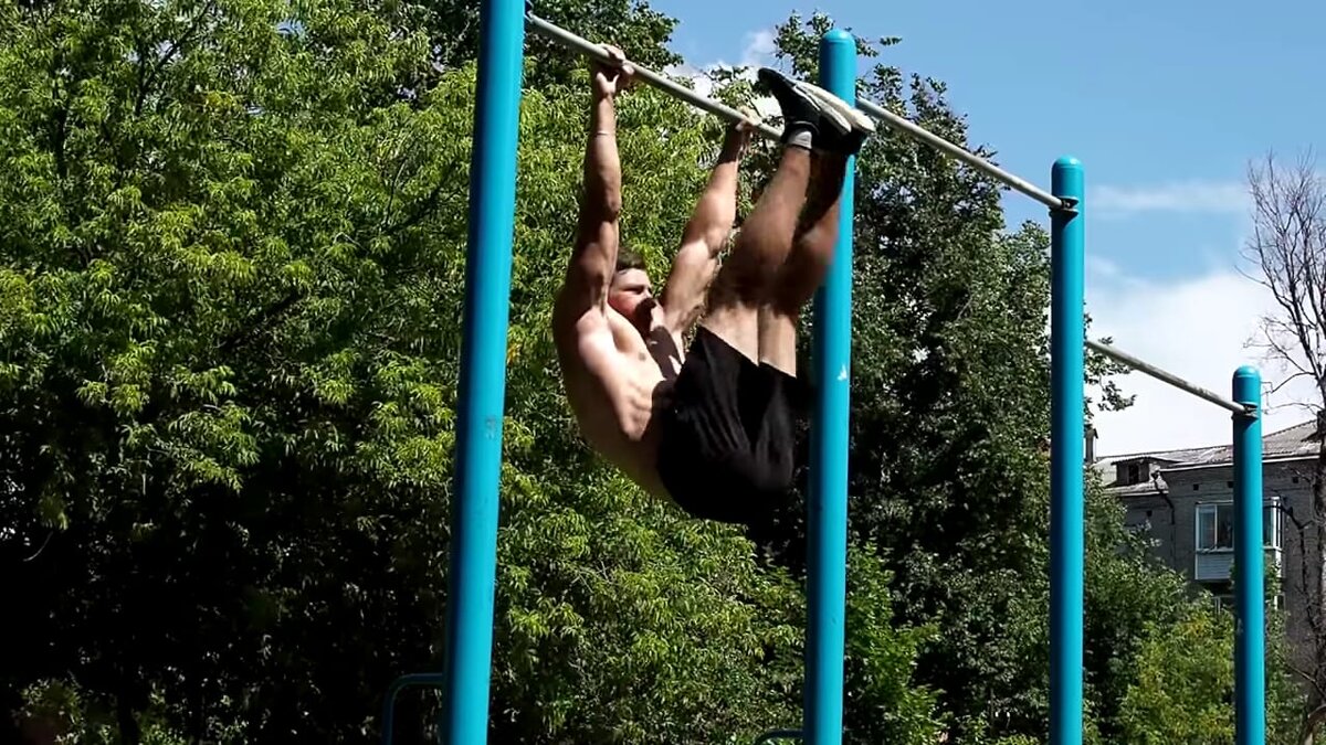 Обычные поднятия прямых ног к перекладине. Если прямые ноги поднять не получается, поднимайте согнутые на 90 градусов. Важно делать без раскачки.