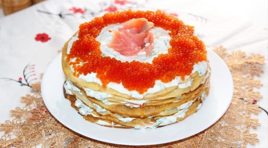Такой блинный тортик - настоящий деликатес! Готовить его просто, а на столе смотрится празднично и эффектно! Крем можно делать из сливочного или творожного сыра. Красную рыбу можно использовать и соленую, и слабосоленую, и даже копченую . Как приготовить блинный торт «Царский» с лососем. Время приготовления 40 минут.