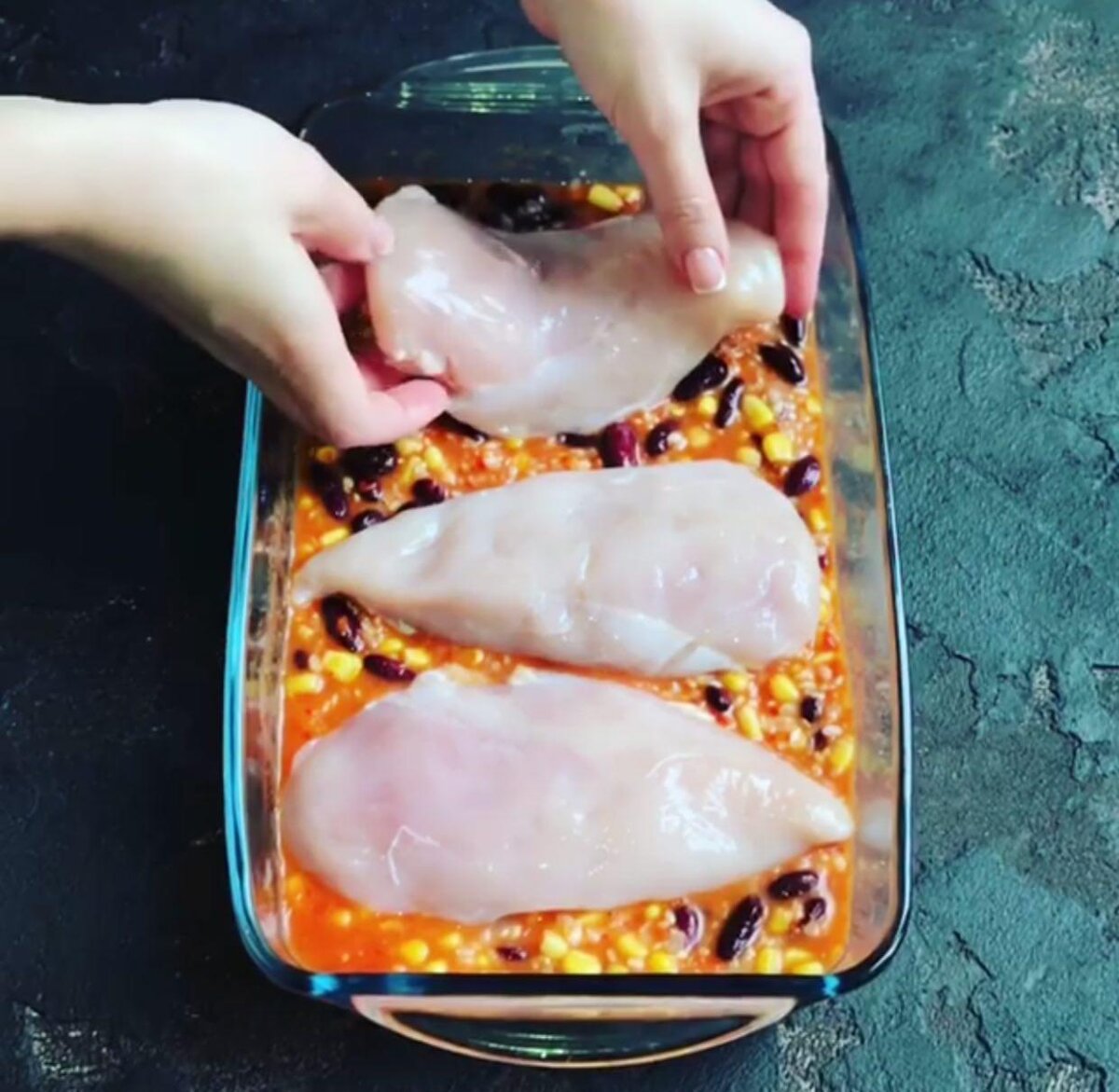 Очень простое, но при этом вкусное и красивое блюдо. Удивите своих близких, потратив минимум усилий и времени. 147 ккал/100 гр., Белки/Жиры/Углеводы - 13.8/3.5/18.9 Ингредиенты ПРИГОТОВЛЕНИЕ 1. Кукурузу, фасоль и рис выкладываем в форму. 2. Помидоры необходимо обдать кипятком и снять с них кожицу. Далее кладем в блендер, добавляем соль, перец, немного воды и тщательно перемалываем. 3. Выливаем томаты в форму и тщательно перемешиваем. Не забудьте посолить и поперчить. 4. Куриное филе промыть водой, натереть солью, перцем и прованскими травами и выложить сверху на рис с овощами, немного утопив в рисе. 5. Закрываем форму фольгой и запекаем в разогретой до 180 градусов духовке в течении 40 минут. 6. Достать их духовки, присыпать сыром, натертым на мелкой терке и поставить запекать еще на 10 минут. ️ Если вам понравился рецепт, ставьте лайк и подписывайтесь на мой канал❤️ Приятного аппетита!