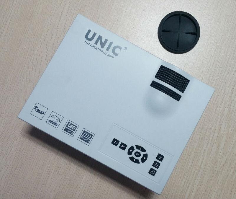 А вот и сам проектор UNIC UC40+. Устройство отличается компактными габаритами и малой массой. Его можно без труда брать с собой на работу, в гости, на дачу и даже в путешествие.