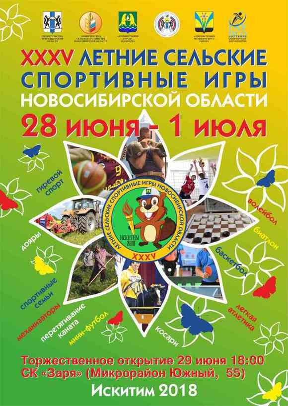 Финал XXXV летних сельских спортивных игр Новосибирской области. 28 июня – 1 июля. Искитим Город Искитим впервые в своей истории станет местом проведения главного областного спортивного праздника. В этом году программа летних сельских спортивных игр Новосибирской области как никогда насыщенна. Соревнования проводятся по 15 видам спорта – это армрестлинг, баскетбол (в том числе 3 х 3), биатлон (летний), волейбол, гиревой спорт, городошный спорт, лапта, легкая атлетика, настольный теннис, пауэрлифтинг, полиатлон, перетягивание каната, самбо, тяжелая атлетика, футбол (в том числе мини-футбол). Кроме того, медали предстоит разыграть доярам, механизаторам, косарям и спортивным семьям – каждая из этих категорий участников выступит по своей программе многоборья. Спортсмены соревнуются в двух группах: первая объединяет команды городов и районов области с населением 30 тысяч человек и более, вторая – с населением менее 30 тысяч. Состязания специалистов сельского хозяйства первый р