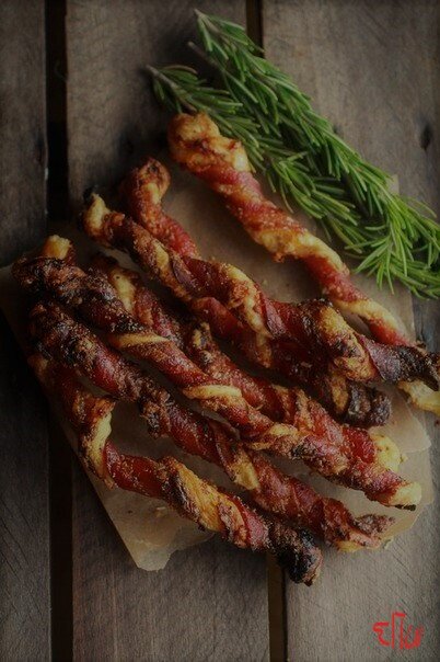 - Пласт теста обмазываем взбитым яичком. Далее присыпаем приправы. Можно и посолить по вкусу опять же кто как любит. Далее посыпаем слоем сыра, и прикатываем скалкой не сильно. - Далее тесто разрезаем на полоски примерно шириной сантиметра по 2, скручиваем аккуратненько каждую полоску и оборачиваем беконом.