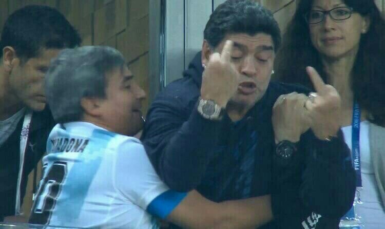 Диего Армандо Марадону могут лишить права посещать матчи Чемпионата Мира 2018, из-за некультурного поведения во время матча в котором встречались сборные Нигерии и Аргентины. Победа Аргентины над Нигерией сопровождалась бурной поддержкой со стороны легендарного аргентинского футболиста Диего Марадоны. Изрядно перебрав Марадона ярко выражал свои эмоции, а в момент победного гола на последних минутах матча и вовсе показал два средних пальца, отправив подобный посыл хейтерам и прочим ненавистникам Аргентины. Ну а после матча бывшему футболисту потребовалась помощь, так как самостоятельно покинуть трибуны стадиона легенда увы не сумел. Также в некоторых СМИ утверждается что Марадоне потребовалась помощь медиков. Кстати говоря с самого начала турнира, Марадону тепло встречали отдельные болельщики России, это неудивительно ведь кто не захочет угостить и повеселиться в компании легендарного футболиста. Напомним что Марадона был замешан в ряде других скандалов и в прошлом. Так например,
