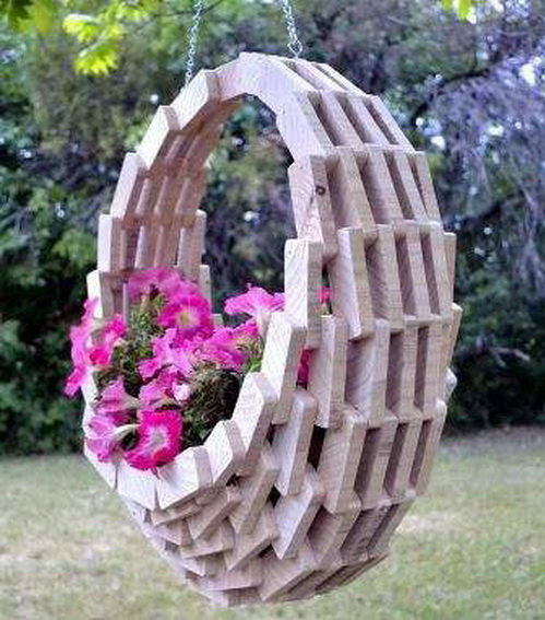 Берем доску. Как следует её тщательно шлифуем и фрезеруем. Далее нарезаем заготовки в виде вот таких вот кусочков. Из них делаем окружность таким способом, как показано на фото. Постепенно гвоздями прибиваем ряд за рядом, соблюдая шахматный порядок и собирая своеобразную корзину. Следует прибивать только после нанесения столярного клея в месте(соприкосновения) кусочков. Одна из сторон практически готова. Вид с другой стороны или половина кашпо изнутри. После того как клей высохнет, поднимаем конструкцию. Вот такое изделие получается в конечном итоге! Крепим цепь как показано на фото. Дно кашпо устилаем плотной пленкой, для того чтобы земля не проваливалась сквозь кашпо. Вот такая красота будет на вашем дачном участке радовать вас, соседей или случайных прохожих. Удачи на даче! Мы будем очень благодарны, если вы подпишетесь на наш канал и поставите лайк. Этим, вы даете нам мотивацию делать посты более качественней и интересней! Источник: https://eurosamodelki.ru/