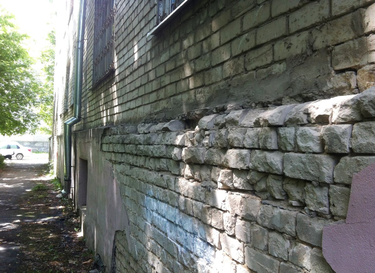 – выпадение кирпичей и выветривание раствора из швов (более 15% кирпичной кладки цоколя).