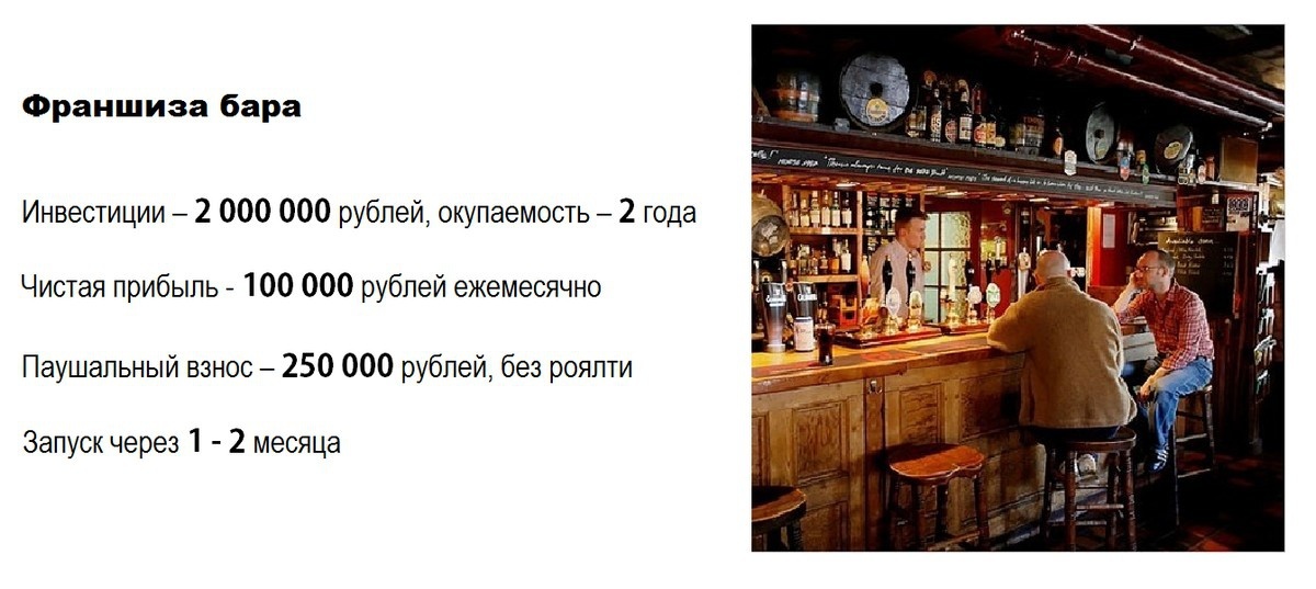 Сергею понравилась атмосфера заведения и он спросил, что надо, чтобы открыть такое же. По рукам они ударили уже под утро. Через две недели Сергей заплатил 250 000 рублей продавцу франшизы по договору концессии, уволился с работы и начал искать место для бара у себя городе.