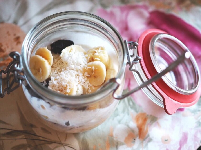 Ванильный сахар - по вкусу Всем известно насколько полезен завтрак. Но не всегда утром на него есть время или силы. Этот рецепт обеспечит Вас уже готовым завтраком, и не придется рано вставать и стоять у плиты или наедаться бутербродами на скорую руку. Итак, все ингредиенты у нас под рукой, приступаем к приготовлению. Засыпаем в банку овсяные хлопья. Нарезаем половинку банана на кусочки и добавляем в банку к овсянке. Туда же добавляем молоко и йогурт, тщательно перемешиваем. В получившуюся смесь засыпаем ванильного сахара (или ванилина) по вкусу. Так же по вкусу можно добавить какао-порошок (или нескви