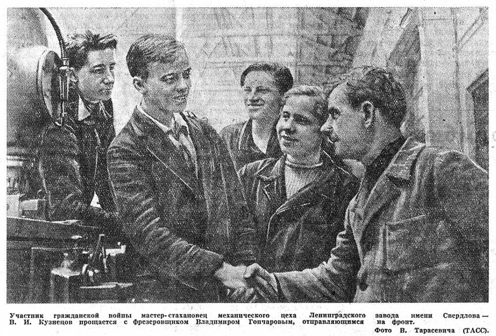 Участник гражданской войны мастер-стахановец механического цеха Ленинградского завода имени Свердлова — В. И. Кузнецов прощается с фрезеровщиком Владимиром Гончаровым, отправляющимся на фронт. Фото В. Тарасевича (ТАСС). «Известия» № 150 (7526) от 27.06.1941 г. ПРЕССА ВОЙНЫ 1941-1945