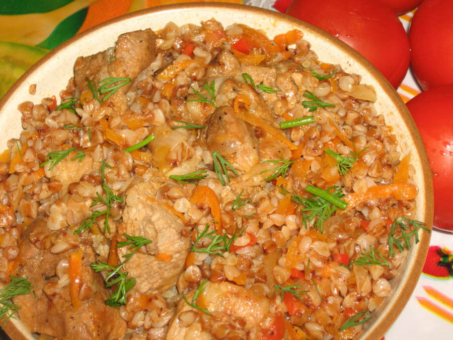Добавляем в сковородку, убираем крышку с зажарки, всё тщательно перемешиваем и жарим на среднем огне, даже чуть больше, до готовности, масса должна немного загустеть 5. В кастрюлю насыпаем гречневую крупу и добавляем 2 стакана воды, после того как вода закипит - солим, перемешиваем и варим гречу до готовности 6. После того, как всё приготовили, можно в одной кастрюле смешать курицу с гречей, а можно подавать отдельно