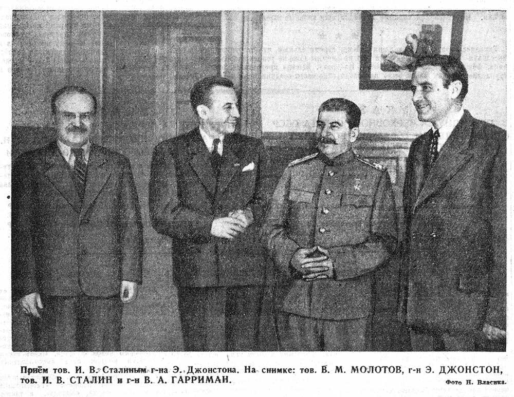Приём тов. И. В. И. В. Сталиным г-на Э. Джонстона. На снимке: В. М. МОЛОТОВ, г-н Э. ДЖОНСТОН, тов. СТАЛИН и г-н В. А. ГАРРИМАН.