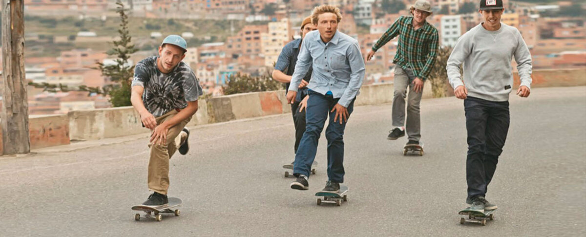 Джинсы уже давно стали излюбленной вещью скейтеров по всему миру. Качественный деним практичен, износостоек и частично смягчает трение с поверхностью при падениях. Также джинсы со временем красиво состариваются, приобретая индивидуальные черты. В случае со скейтбордингом такой подход приобретает еще более актуальный характер. Катание, падения, случайные зацепы – все впоследствии отражается на внешнем виде джинсов. Светлый деним аналогично меняет свой внешний вид в процессе носки, однако не стоит порой пренебрегать стиркой –испачканные места не всегда смотрятся уместно. На протяжении нескольких десятков лет скейтеры по всему миру катаются в джинсах Levi’s. Но бренд обратил внимание на скейтеров лишь в 2013 году, запустив линейку Skateboarding. Впрочем, Levi’s, понимая особенности культуры, старался привнести что-то взамен. Бренд спонсирует райдеров и поддерживает инициативы скейтеров по строительству D.I.Y. скейт-парков . Продукция Levi's Skateboarding также сделана совместно с людьми