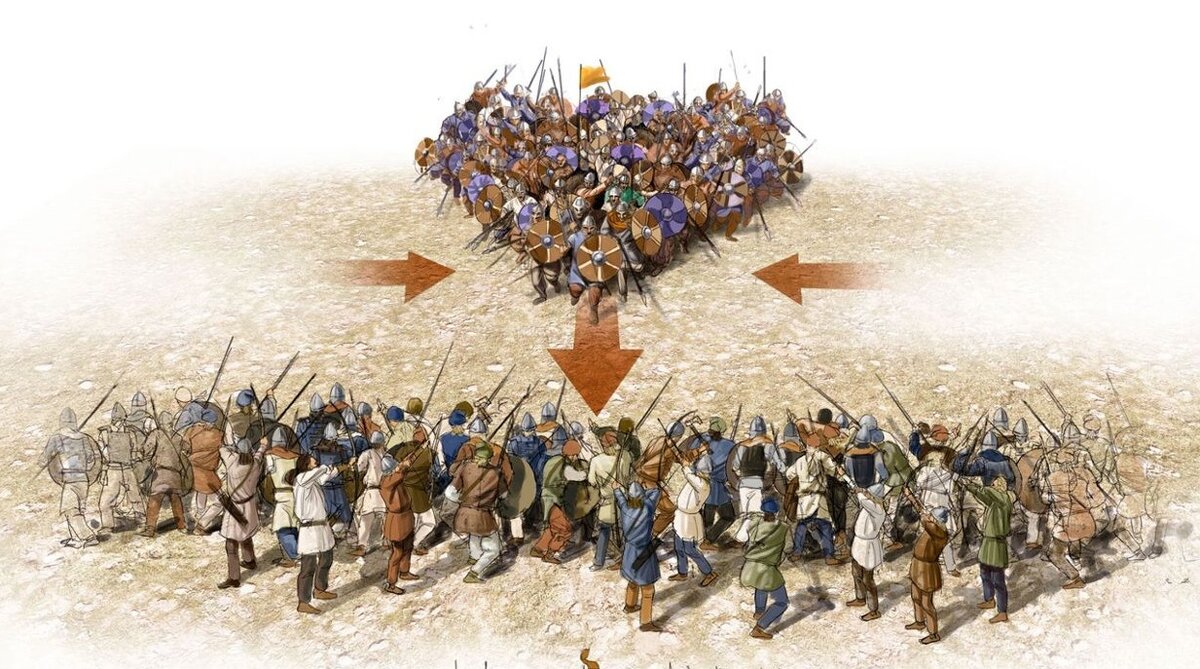 Наиболее узнаваемым маневром викингов, конечно же, является "стена щитов" (skjaldborg). Оборонительный боевой порядок, в котором воины полностью закрываются от врага, выставив щиты внахлест, столь узнаваем благодаря присутствию в ряде экранизаций. Однако не совсем понятно, почему в популярном изображении "стена щитов" викингов стала своего рода римской тестудо (или "черепахой"). Так или иначе, этот маневр гораздо известнее "свинфилкинга" (svínfylking) или "свиньи" - наступательного порядка скандинавов. В целом данное боевое построение представляло собой клинообразный строй, который римляне в древности переняли у германцев. К примеру, о нем писали такие античные авторы, как Вегеций, Аммиан Марцеллин и Ливий. Итак, перейдем к доступным источникам, благодаря которым нам известно о наступательном маневре знаменитых воинов. Жил в XII-XIII веках датский историк Саксон Грамматик, автор хроники "Деяния данов" - значительного труда по ранней истории Дании. В своей работе он представил происхожд
