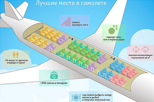 Бронирование мест в самолете – не такая простая задача, как кажется. Какие места самые комфортные в салоне и почему? Выделим их в отдельные группы: * Места у иллюминатора Среди плюсов – отличный вид, вас никто не беспокоит во время перелета, протискиваясь мимо. Однако вам придется тревожить соседей. * Место у прохода Позволяет наблюдать за происходящим в салоне. Можно беспрепятственно вставать во время перелета, ходить в туалет, раньше готовиться к выходу. Однако бортпроводники и другие пассажиры могут случайно задевать вас во время своих перемещений. * Места в середине Вы всегда будете находиться «в обществе» - ваши соседи будут располагаться с двух сторон. Можно немного наблюдать вид из окна и обстановку в салоне. Придется беспокоить одного соседа и беспокоиться из-за другого. * Места у аварийных выходов Большее расстояние между впередистоящими креслами позволяет комфортно расположить ноги. Аварийные проходы нельзя загораживать вещами. * Передняя часть салона