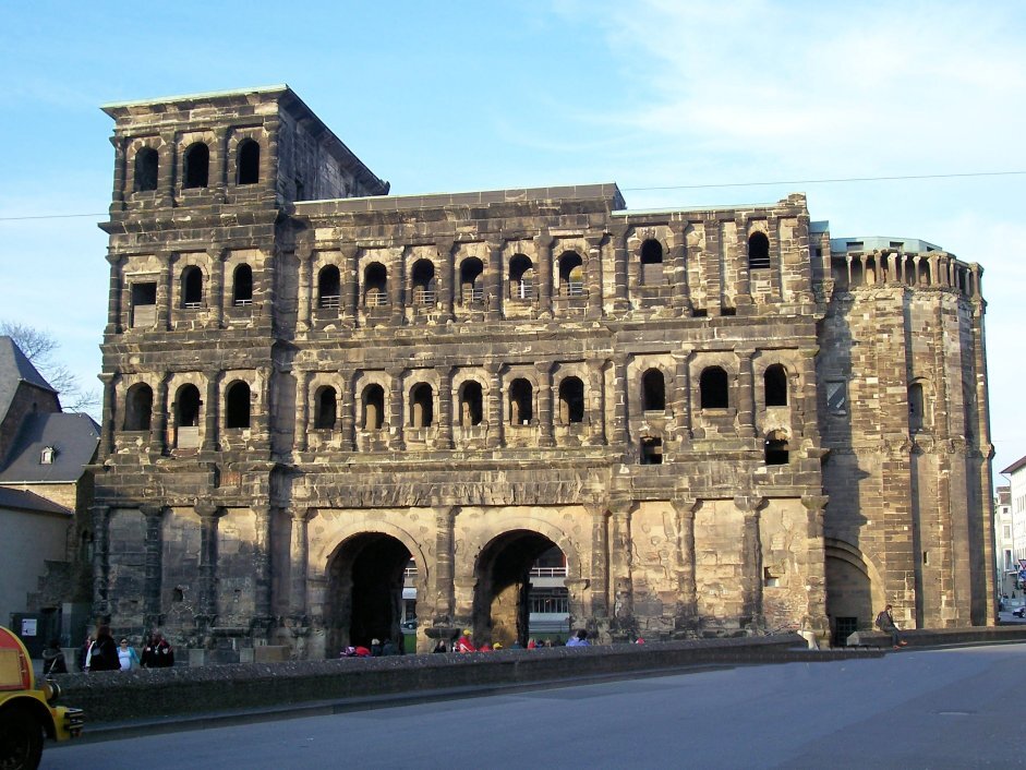 Базилика Константина может быть самым исторически значимым памятником в Трире, но самый архитектурный неповрежденный римский памятник во всем Трире - это Порта Нигра (Черные ворота). Сегодня Черные ворота расположены прямо в конце городской площади. Вы можете пообедать или kaffee und kuchen (кофе и пирог) и пристально смотреть на Черные ворота так долго, как вам нравится. Черные ворота были первоначально бледно-серыми, почти белыми и были построены примерно в 186-200 г. н.э. Черные ворота были одним из четырех городских ворот, которые когда-то существовали в Трире.