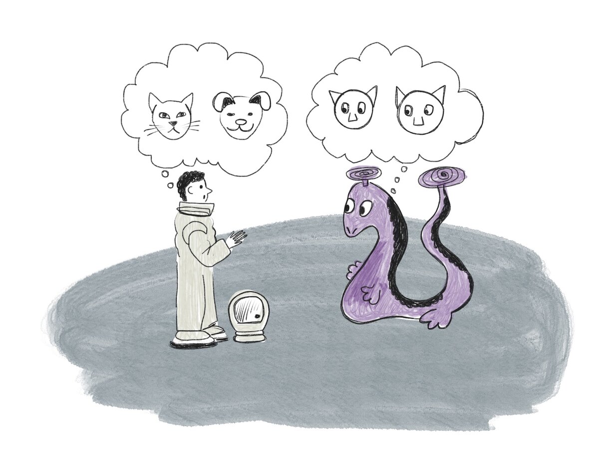 Знакомьтесь, это юпитерианин Йжун, и он никогда в жизни не видел ни кошек, ни собак. Вы внезапно встретились с ним при подлёте к Марсу, и вам просто приспичило рассказать новому другу, чем кошки отличаются на вид от собак.