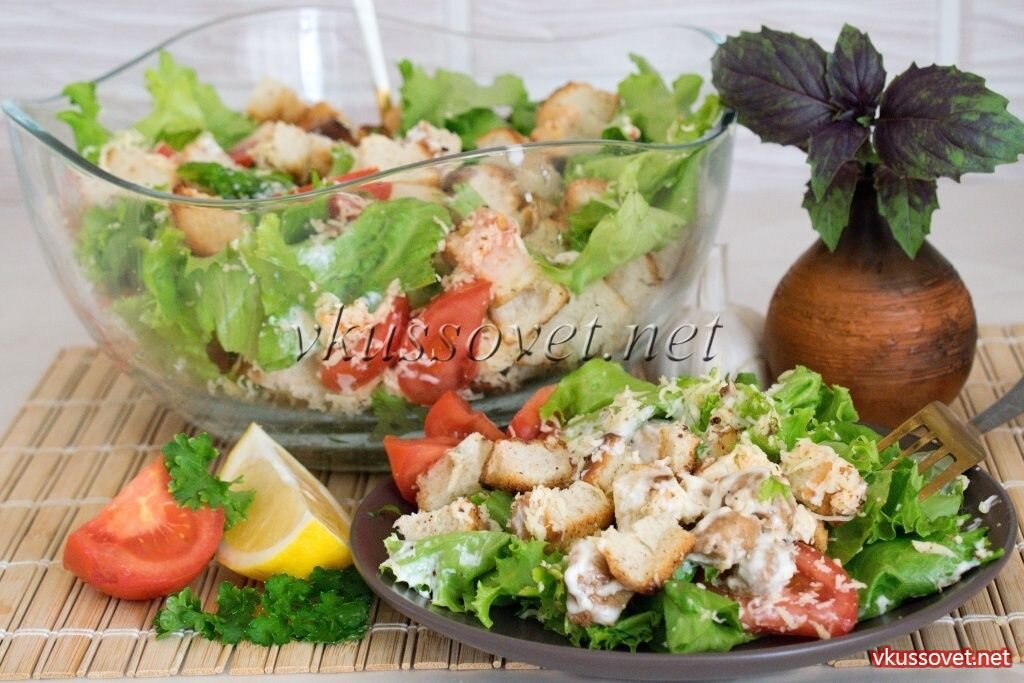 Рецепт приготовления традиционного салата «Цезарь» с кусочками поджаренной курицы, гренками и помидорами. Приправляется салат соусом с майонезом, соком лимона и чесноком. Салат «Цезарь» является изюминкой североамериканской кухни, а также самым популярным и любимым блюдом на нашем, русском, праздничном столе. Не секрет, что каждая хозяйка готовит его по-своему, добавляет, что-нибудь от себя или то, что имеется под рукой – отсюда и появляются самые разные версии и вариации приготовления. Рецепт этого салата тоже можно назвать одной из вариаций на эту тему, он более приспособлен для нашего гастронома-гурмана. Незамысловатый набор продуктов и вот – салат «Цезарь» на вашем столе. Необходимые ингредиенты: 1 куриная грудка; 200 – 250 г. белого батона (хлеба); 2 пучка листового салата (промытые и обсушенные); 3 помидора; 100 г. твердого сыра; 150 мл. соевого соуса; 4 зубка чеснока; 1 ст. ложка лимонного сока; 2 ст. ложки растительного масла. Заправка: 4 – 5 ст. ложек майонеза;