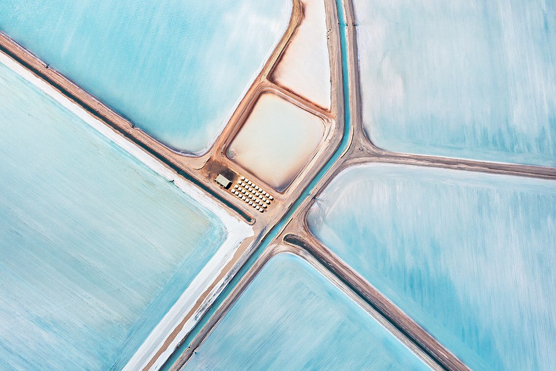 Спросите Саймона Баттерворта о самом необычном фотопроекте, который он когда-либо проводил, и он ответит «Голубые поля» . «Я думаю, что соляные поля Австралии это одно из самых красивых мест, которые я когда-либо видел, даже Тадж-Махал не сравнится с ними», - говорит он. «Никто не верил мне, пока я не показал им свои снимки». «Blue Fields» (Голубые поля) — это серия работ фотографа из Шотландии Саймона Баттерворта. Для того, чтобы получить такие снимки Баттерворт пролетел над заливом Шарк (объектом Всемирного наследия ЮНЕСКО), охватывающим 3,2 миллиона акров островов и полуостровов, но его внимание привлекли именно эти лазурные поля. «Это место идеально подошло для моего проекта «Blue Fields». Промышленный район в самом сердце природного объекта Всемирного наследия покорил меня», - говорит он. Перед взлетом у пилота появилась безумная идея открыть дверь самолета, чтобы максимально расширить круг обзора для фотографа. Хотя Баттерворт и согласился с таким экспериментом, вначале он у
