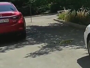 Ящерица прогулялась по парковке и скрылась в траве. Скорее всего, животное каким-то образом убежало от хозяина.