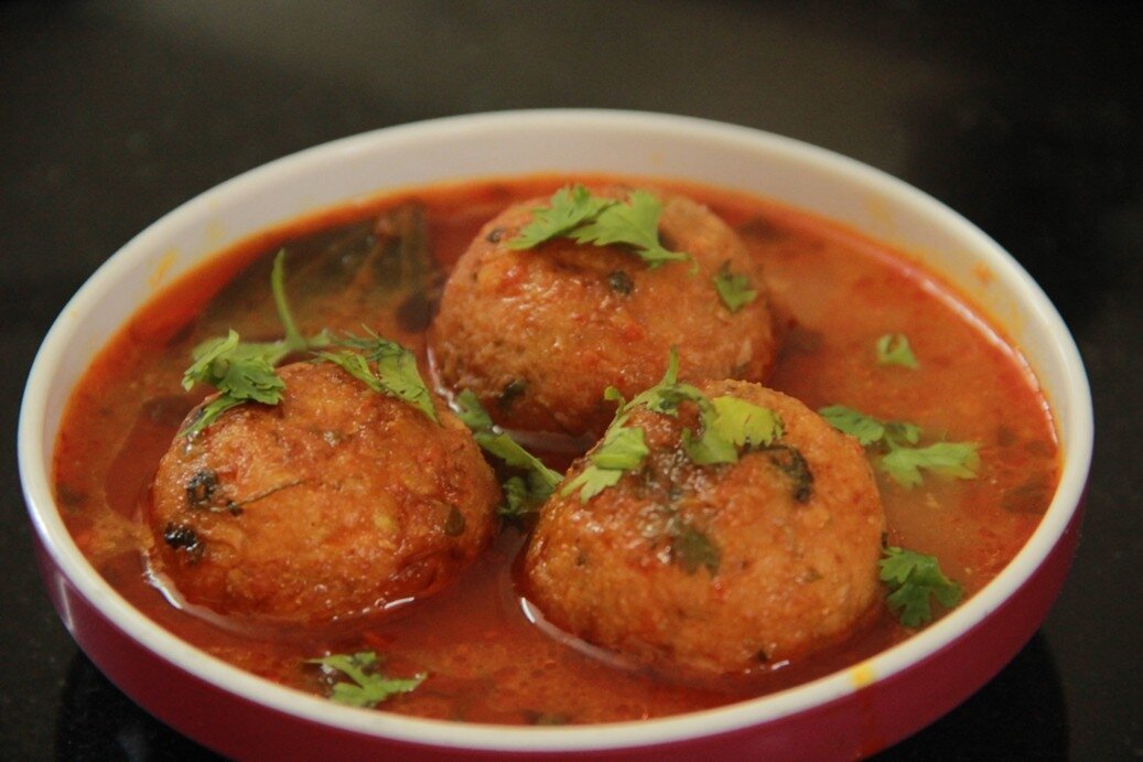 Обжаренные шарики выкладывайте сначала на бумажное полотенце, чтобы убрать лишнее масло. Затем залейте их приготовленным томатным соусом, посыпьте оставшейся зеленью и подавайте.