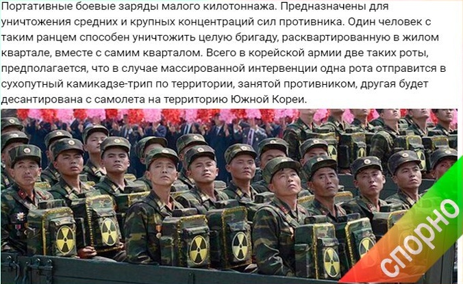 Откуда информация? Эти рюкзаки были показаны в ходе военного парада Северной Кореи 27 июля 2013 года. На площади появилось по меньшей мере три армейских грузовика, в которых сидели военные со странными прямоугольными рюкзаками на груди. На каждом был прилеплен характерный желто-черный знак радиационной опасности. А что это? Некоторые успокоительно заявляют, что в грузовиках просто сидели подразделения радиационной защиты. При этом, большинство экспертов сейчас сходится на мысли, что Пхеньян хотел намекнуть, что у него есть запас переносных ядерных зарядов. Которые можно забыть где-нибудь в метро Нью-Йорка или в подземных торговых рядах Токио. Или же послать с таким рюкзачком к нужной цели героического бойца, готового с восторгом пожертвовать собой ради высоких идеалов. У спецподразделений США якобы есть нечто похожее, хотя наличие или отсутствие такого оружия Вашингтон никогда не подтверждал и не опровергал. Впрочем, источник в правительстве Южной Кореи уже высказал сильные сомнения