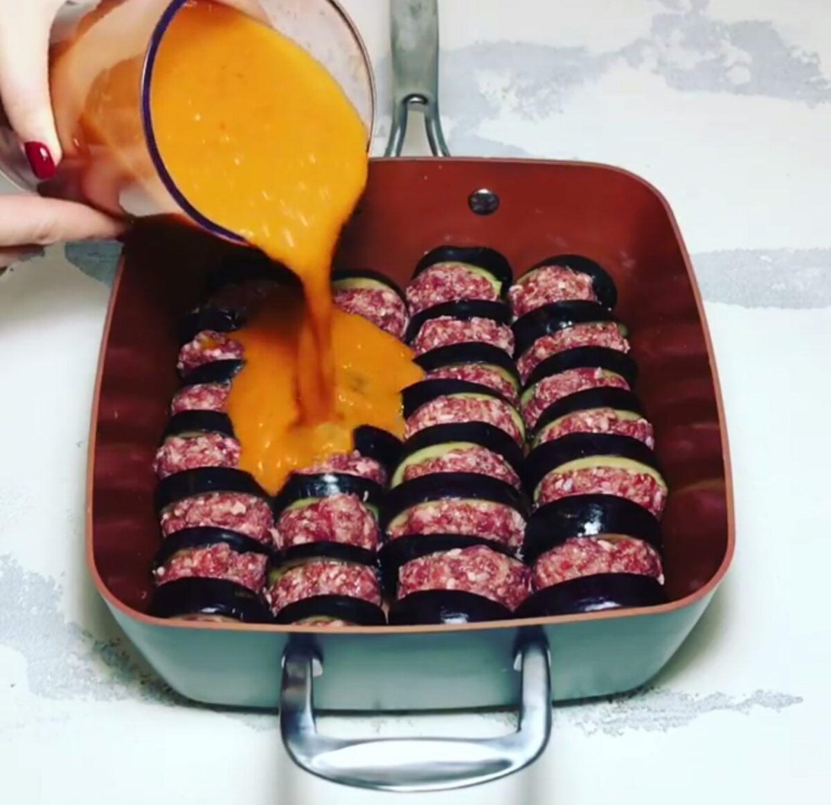 Очень простой способ вкусно приготовить баклажаны. Этот рецепт точно станет вашим любимым! 127 ккал/100 гр., Белки/Жиры/Углеводы - 9.8/4.7/2.3 Ингредиенты ПРИГОТОВЛЕНИЕ 1. Баклажаны вымыть и нарезать кружочками примерно 1 см толщиной. 2. Сложить баклажаны в миску и хорошо посолить, перемешать и оставить на 20 минут. Затем промыть водой и высушить. 3. Морковь, лук, помидоры и болгарский перец мелко порезать и потушить без добавления масла. 4. Добавить соль, перец, специи и тщательно измельчить в блендере. Получился соус. 5. Говядину вымыть, высушить и сделать фарш. 6. Из фарша сформировать небольшие котлетки. 7. В глубокую сковороду или форму выкладываем по очереди баклажаны и котлетку. При этом надо прижимать мясную котлетку дольками кабачка, чтобы немного сплющить ее. 8. Залить соусом, посыпать сыром, натертым на крупной терке. 9. Запекать в духовке при температуре 180 градусов примерно 40-45 минут. ️ Если вам понравился рецепт, ставьте лайк и подписывайтесь на мой канал❤️Прият