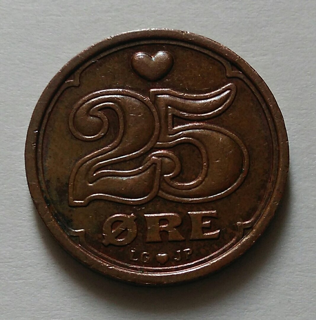 Двадцать пять ере.Дания. Сделана в Дании из бронзы в период правления Королевы Маргрете II (1989 - 2017) В обиходе по сегодняшнее время . Реверс На главной стороне монеты можно увидеть номинал "25", выше которого выпуклое сердце,ниже которого - надпись "Ore" , еще ниже надпись "LG JP" ,разделенное небольшим сердечком. Аверс С самого верху - год выпуска,2000 год. Ниже - корона королевы Маргрете II Самый низ - надпись "DANMARK" , недалеко от которой знак монетного двора .