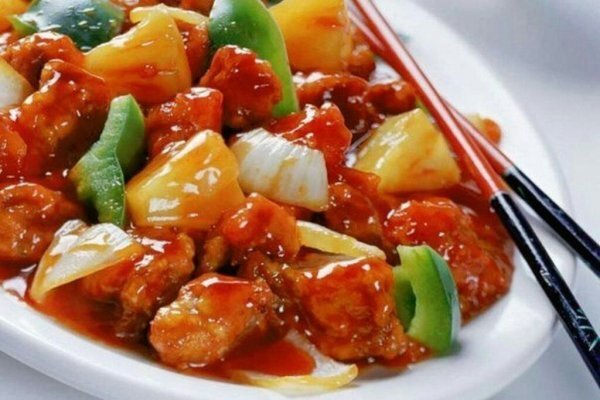 ИНГРЕДИЕНТЫ: куриное филе 300 г перец сладкий болгарский 40 г морковь 40 г лук репчатый 40 г зелень свежая 1 пучок перец чили 1 шт. соус соевый 2 ст.л. томатная паста 1 ст.л. чеснок 1 зубчик масло оливковое 1 ч.л. перец черный молотый по вкусу соль по вкусу ПРИГОТОВЛЕНИЕ: 1. Нарезать большими кубиками куриное филе, обжарить на оливковом масле. 2. Мелкими кубиками нарезать репчатый лук, морковь и сладкий болгарский перец. 3. Разогреть масло на сковороде, обжарить овощную нарезку в течение пяти-семи минут. 4. Влить соевый соус и готовую томатную пасту. 5. Потушить овощи в течение 15 минут. 6. В конце приготовления добавить перец чили и нарезанный чеснок. 7. Выложить куриное филе. 8. Ингредиенты перемешать и подержать на среднем огне три минуты. 9. В конце приготовления посыпать блюдо любой измельченной зеленью, посолить, поперчить.