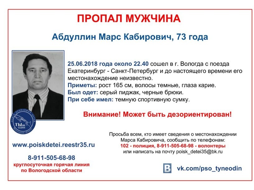 Мужчина прибыл на поезде Екатеринбург – Санкт-Петербург 25 июня, в 22.40. Пропавший – 73-летний Абдуллин Марс Кабирович. Приметы: рост 165 см, темные волосы, карие глаза. Был одет в серый пиджак и серные брюки. При себе имел темную спортивную сумку. Волонтеры поисково-спасательного отряда «Ты не один» предупреждают, что пенсионер может быть дезориентирован. Поисковики просят всех, кто владеет какой-либо информацией о местонахождении Марса Абдуллина, просят сообщить по телефонам: +7911 505-68-98 (волонтеры) или 102 (полиция). В настоящее время ничего о его судьбе и местонахождении не известно. https://gorodvo.ru/news/incident/5794/
