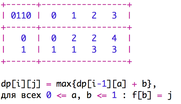 На сайте acmp.ru добавились 300 новых задач, и сейчас самое время их решить. Очень интересная задача. Одно условие чего стоит! Оно даёт введение в булеву алгебру, если вдруг раньше не приходилось иметь с ней дела (но это, правда, вряд ли). Итак, нужно максимизировать количество единичек. Воспользуемся методом динамического программирования. Состоянием динамики будет пара: сколько операций уже сделали и какой результат (0 или 1). Значение - количество единичек. А переходов два: поставить 0 и поставить 1. Или меньше, так как заданная булева функция накладывает ограничения. Рассмотрим получившуюся таблицу на первом примере: Но в этой задаче надо восстановить и саму последовательность. И есть два способа: