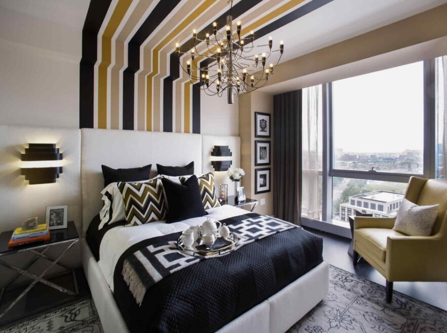 Другая идея, которую рекомендуют некоторые дизайнеры – вертикальные полосы. Но они визуально создадут ограниченное пространство и сделают спальню визуально больше, НО значительно УЖЕ!