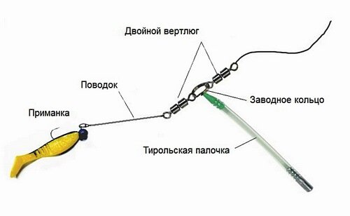 Международный сервис бронирования рыбалок В некоторых странах спиннинг, оснащенный тирольской палочкой, считается браконьерской снастью. Тирольская палочка, как вид оснастки для ловли на течении известна как минимум с пятнадцатого века. Впервые она появилась в исторической области Австрии, которую называют Тироль, отсюда и название. Как элемент оснастки современная тирольская палочка внешне напоминает поплавок и состоит из трех основных частей: Этот элемент оснастки активно используют поклонники спиннинга в местах, где многочисленные подводные препятствия в виде затопленных кустов и коряг не позволяют применять классические проводки. Способов оснастки существует множество. Простейший вариант включает в себя только один поводок с насадкой. Хотя многие рыболовы используют в оснастке несколько жестких поводков различной длины. Для того, чтобы использовать все преимущества снасти «тирольская палочка», необходимо: (При этом поводок с крючком должен быть длиннее палочки). Ловля при по