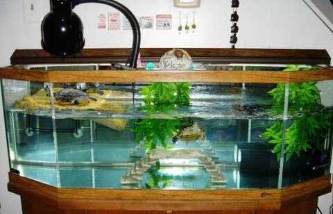 Правильное обустройство аквариума для красноухой черепахи обеспечит ей долгие годы жизни, а вам - здорового и подвижного питомца. При этом нужно знать что именно требуется водяной черепахе. В природе красноухие живут в заболоченных водоёмах с пологими берегами, а значит и в домашнем аквариуме ей нужно обеспечить возможность выбираться на сушу. Выбор подходящего аквариума Объёма в 100 литров достаточно лишь для пары молодых особей с панцирем меньше 10 сантиметров. В слишком маленьком аквариуме черепахам тесно, кроме того, вода в нём портится намного быстрее. С ростом черепахи объём аквариума должен увеличиваться. Форма жилья для красноухой черепахи не принципиальна, но расстояние до верха должно быть не менее 15-20 сантиметров, чтобы черепаха самовольно не покинула аквариум в ваше отсутствие. Для этого же необходима и крышка с вентиляционными отверстиями. Искусственная суша: плотик, коряга, камень Комфортным будет считаться участок суши размером в четверть от общего объёма аквариума. Эт