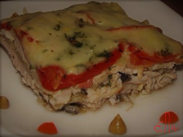 - соль и специи по вкусу. Начнем готовить): - Баклажаны не забудьте помыть, порежьте их вдоль на тонкие пластинки, (удалить хвостики обязательно, и желательно обсушить их) положите в какую нибудь посуду и посолите и оставьте на 20-30 минут, чтоб лишний сок с них ушел, сок сливаем, он нам не нужен. Филе курочки, моем, хорошенько обсушиваем, и режем в моем случае на четыре равные части. Порезанную курочку отбиваем, и убираем пока в сторону). - Помидорки моем, удаляем "попки", и нарезаем их колечками, чеснок мо