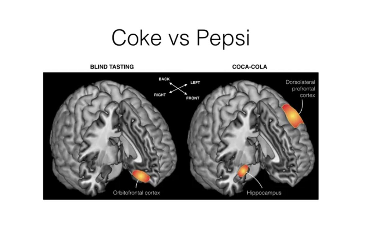 Знаменитый скандальный эксперимент с Кока и Пепси, с которого начался рост нейромаркетинга. В слепом тесте люди пили что-то и слева вы видите активацию центра вознаграждения (вентромедиальная префронтальная кора). И это было - Пепси! А справа - активация центров памяти и эмоций (гиппокамп, дорсолатеральная префронтальная кора и средний мозг. И это было - Кока кола! ТО есть телу нравился вкус Пепси, но люди мозгами предпочитали всё, что связано с Кока Колой. Йо)