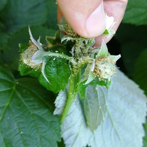 Тля на малине приводит к печальным последствиям, насекомые, быстро размножаясь, заселяют верхушки побегов, листья, соцветия. Первым признаком появления тли на малине являются скрученные листья, которые со временем желтеют, а соцветия малины, пораженные тлёй, сбрасывают бутоны, завязи, верхушки побегов не растут, искривляются, междоузлия укорачиваются. На малину может напасть тля листовая и побеговая, внешне они похожи. Яйца тли могут сохраняться зимой около почек. Когда начинают расти листья, из сохранившихся яиц появляются личинки, они быстро перерождаются во взрослые особи и начинают делать новые кладки. За лето успевает сформироваться 6-8 поколений тли. Часто на побегах заселенных тлей можно увидеть муравьёв, они разносят личинки вредителей по здоровым кустам, чтобы увеличить колонии тли, так как питаются её выделениями. Из-за скорости размножения тли садоводы уже в начале лета часто обнаруживают сразу целые колонии вредителей на малине, когда кусты усыпаны бутонами и начинают