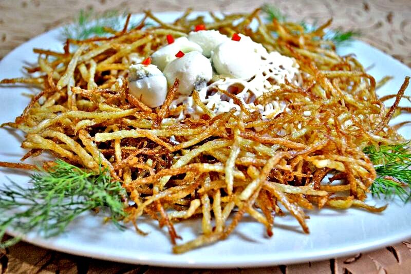 Девочки, я просто обязана вам рассказать об этом салате! Потому что он идеален! Он очень вкусный! Рекомендую сделать его прямо сегодня! Нам понадобится: - Куриное филе - 200 грам - Картофель - 3 штуки - Огурец свежий - 1 штука - Яйца куриные - 2 штуки - половинка репчатого лука - Укроп - 1 небольшой пучок - Майонез - 3 столовой ложки - Соль - по вкусу - Перец черный молотый - по вкусу - любимые специи для курицы - 1 чайная ложка - Перепелиные яички для декора - 3-4 штуки Приступим к приготовлению: Совет! Нарежьте курицу кусочками 1-1,5 см и обжарьте 4 минуты с одной стороны и 2 минуты с другой. За это время курица прожарится и не успеет пересушиться. Либо просто отварите грудку 25 минут, добавив к ней душистый перец и лавровый лист. Очищенный картофель натрите на терке и промойте в дуршлаке, чтобы об не слипался при дальнейшем обжаривании. На разогретой сковороде с маслом обжаривайте маленькими частями картофельную соломку до золотистого цвета. При готовности выкладывайте ее