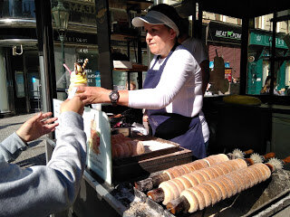 Начинаю со сладкого, настоящей калорийной бомбы, стритфуда по-чешски и традиционного лакомства Чехии, Словакии, Румынии и Венгрии (каждая из стран до сих пор оспаривает право называться родиной этой вкусняшки), с чудесным названием trdlo (трдло) или trdelník (трдельник) (если вы это произнесли, то есть еще название шметдол).