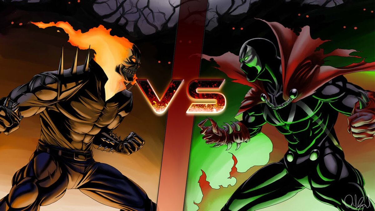 Всем привет! Сегодня сразятся два великих титана. Они необычайно похожи и мне будет очень трудно определиться с ответом... Поехали! Версии полностью раскрыли потенциал своих сил, а Спаун даже убил Мэлболги. Спаун в лесу нашёл грабителя и хотел с ним расправиться, но приехал Призрачный гонщик, который хотел использовать карающий взор. Но спаун ему помешал и началась битва!!! Начнём со Спауна, он в аду подписал договор с Дьяволом после чего стал Спауном, и какие же способности у него есть? Во-первых его тело очень плотное и весит около 200кг, также он целиком состоит из некроплазмы, которая даёт ему сверх человеческую силу, прочность и даже скорость. Внутренние органы у него не работают, и они ему вообще не нужны. Ещё у спауна есть дар чувствовать всю боль и ненависть человечества, что позволит ему на расстоянии чувствовать нападения на себя и других людей. Вся кожа Спауна покрыта костюмом-симбиотом, а плащ цепи и черепа, защищают Спауна, даже если он находиться без сознания. Отдельная т